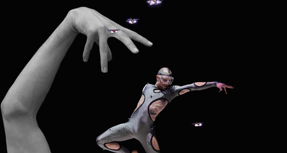 Zoals altijd bij Another Kind of Blue speelt technologie een belangrijke rol, maar hier is ze subtieler aanwezig — als verlengstuk van het lichaam. Virtuele handen bewegen mee via motion capture, terwijl in het werk Arms drones samen een bovenlijf vormen dat reageert op improviserende dansers. Zo ontstaat een directe dialoog tussen mens en machine, waarin technologie niet alleen ondersteunt, maar zelf lijkt mee te voelen. En in Flyland (2016) lijken dansers door de lucht te vallen, gevangen en voortgestuwd door hun eigen schaduwen. Licht en projectie worden hier een danspartner die de wetten van de zwaartekracht opheft en de grenzen van het lichaam vervaagt.